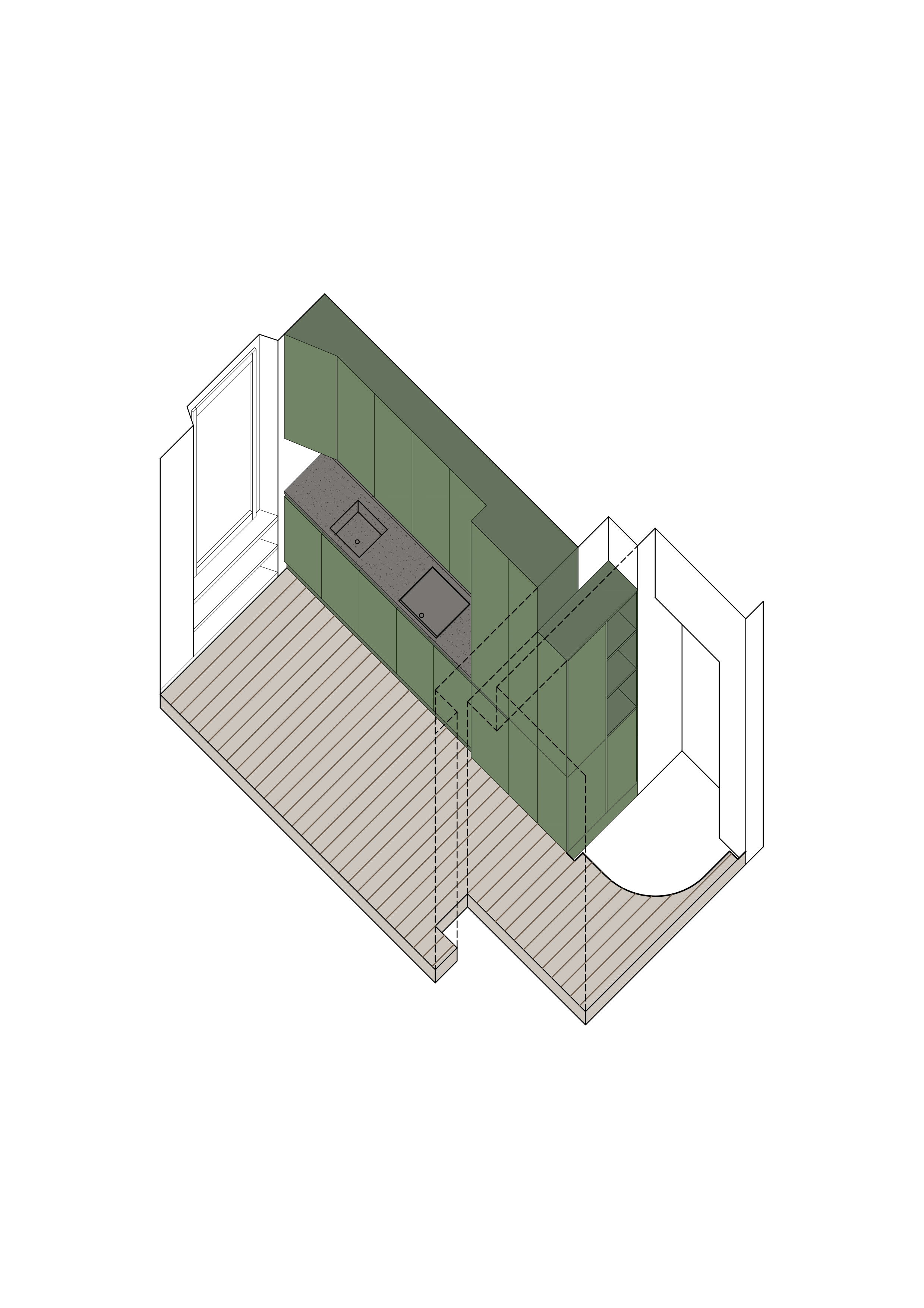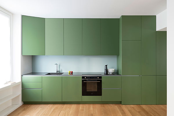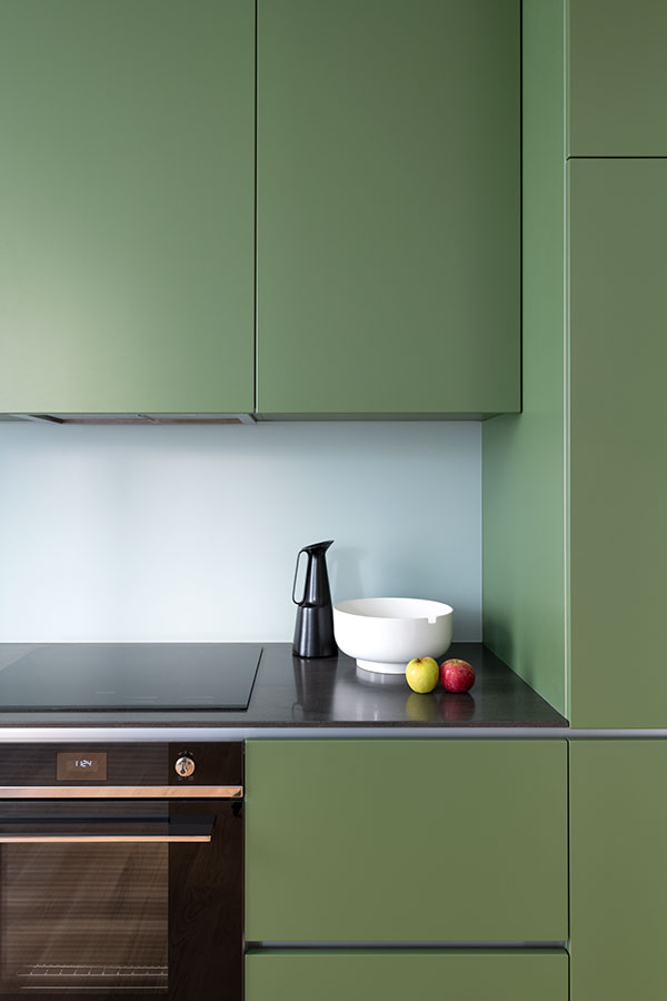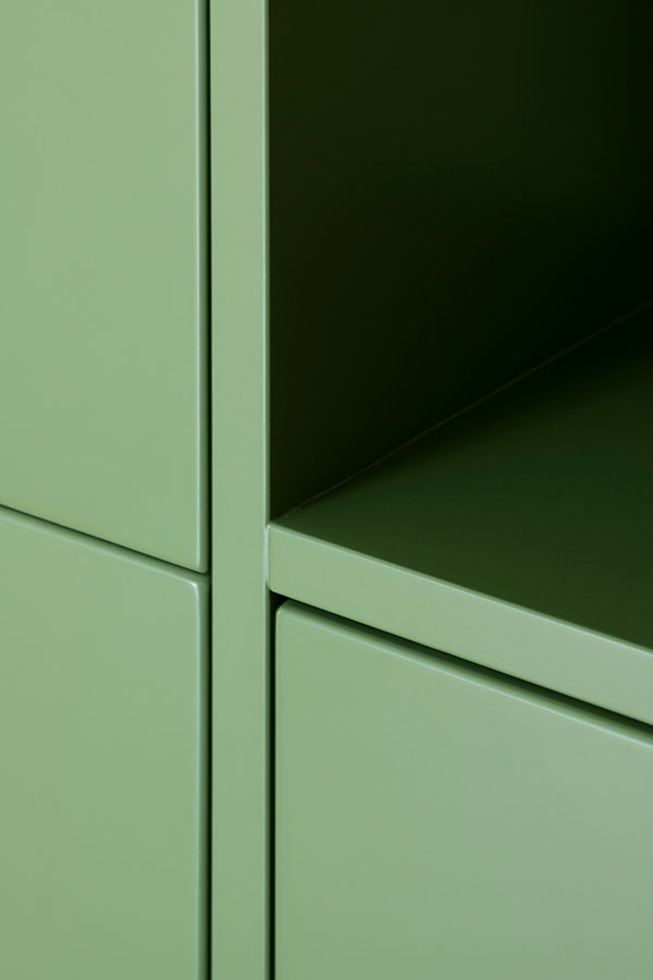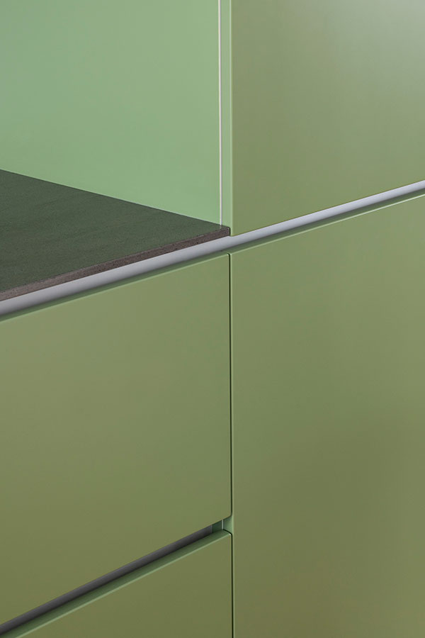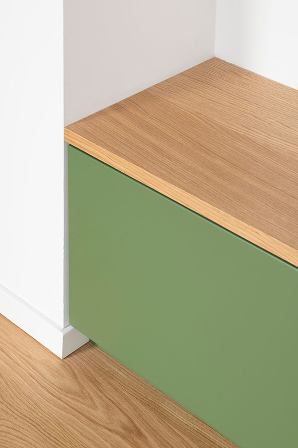 Predominant material is wood in different finishes: natural with open pore finish and matte lacquered in saturated olive green.