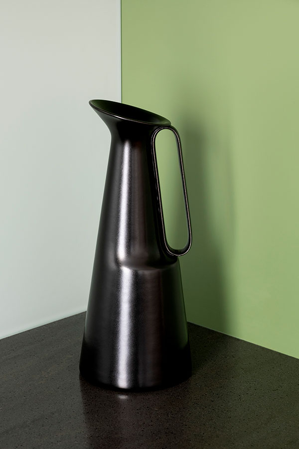 Materiale predominante è il legno in diverse finiture: naturale e laccato verde opaco.