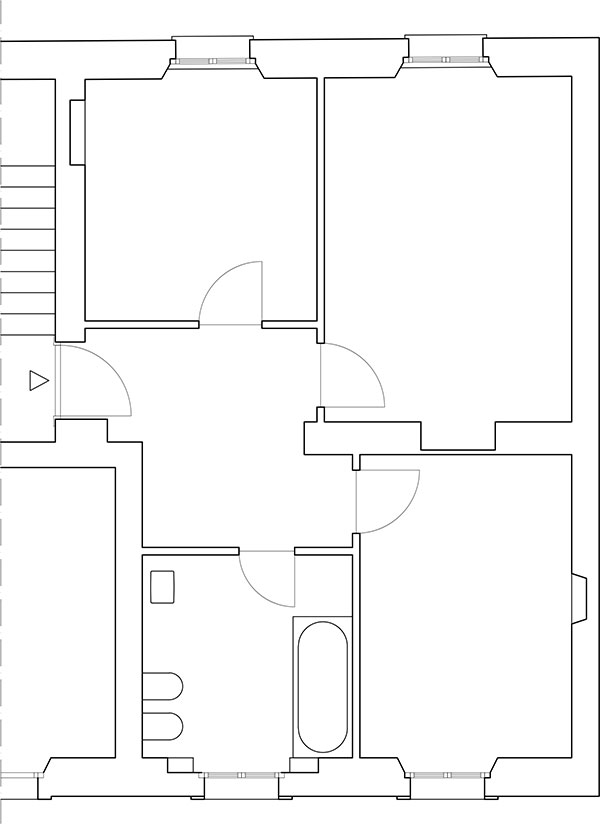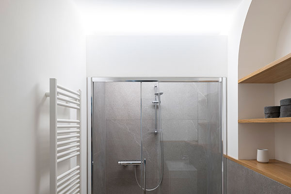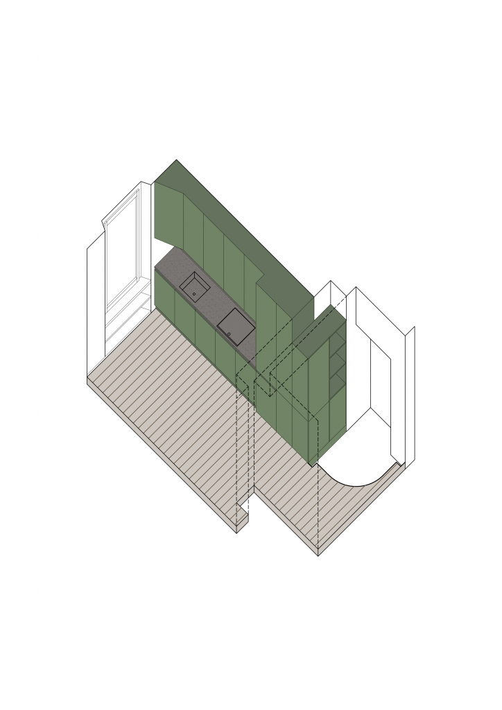 The relocation of the bathroom required the raising of floors; this technical necessity became the project’s anchor: a quarter-round floor cutout riser characterizes the entrance and leads into a large space.