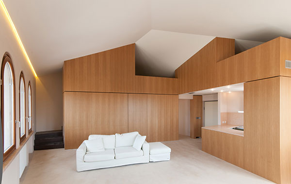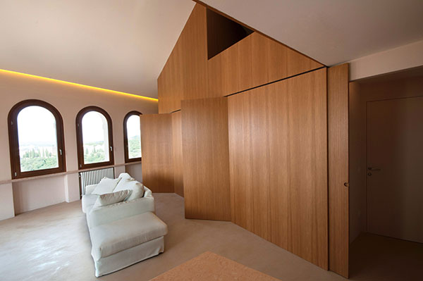 La vista sulla città di Verona definisce in modo univoco la zona living avvolta da un volume in legno di rovere all’interno del quale sono organizzati tutti gli ambienti di sevizio: cucina, bagno, ripostiglio, armadi, ed una scala che conduce al soppalco, zona notte, con affaccio sulla doppia altezza del soggiorno.