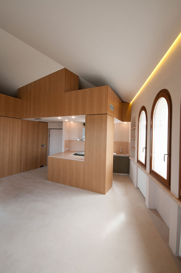 Around it, a wood volume became the container of the service spaces: kitchen, bathroom, storage and a stairs that leads to the bedroom located on the loft with a big opening on the living.