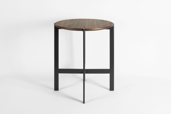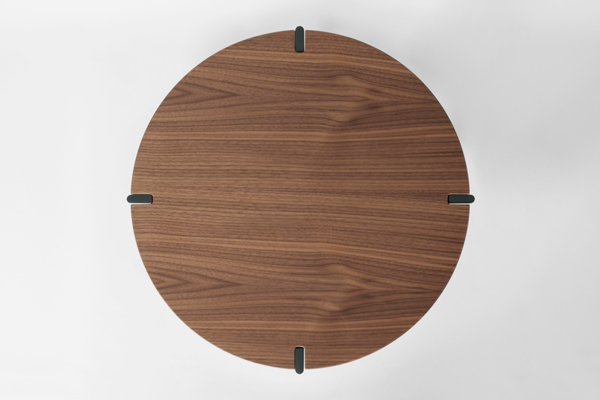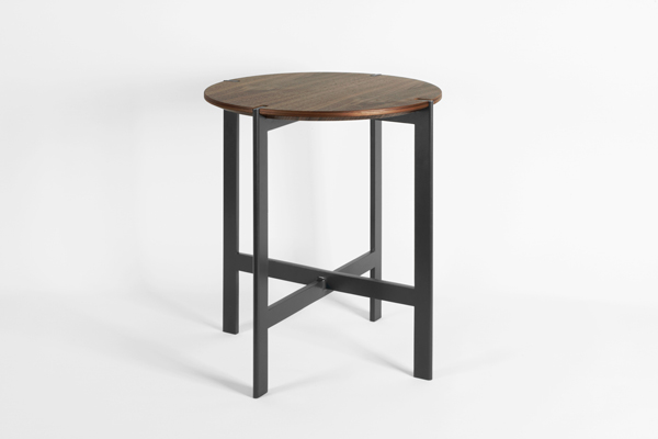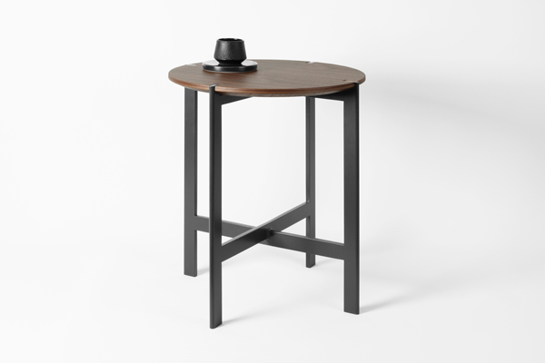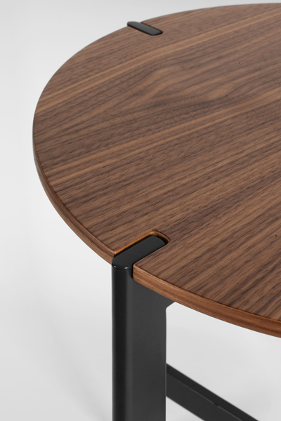 Top in noce americano su una sottile struttura in metallo verniciata a polveri grigio scuro.