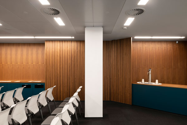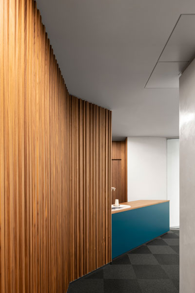 The new, custom designed American walnut panelling of the auditorium stands in contrast to this palette. Conceived as thin 3D skin, it defines the space’s perimeter, concealing and revealing furnishings in a petrol blue lacquer.