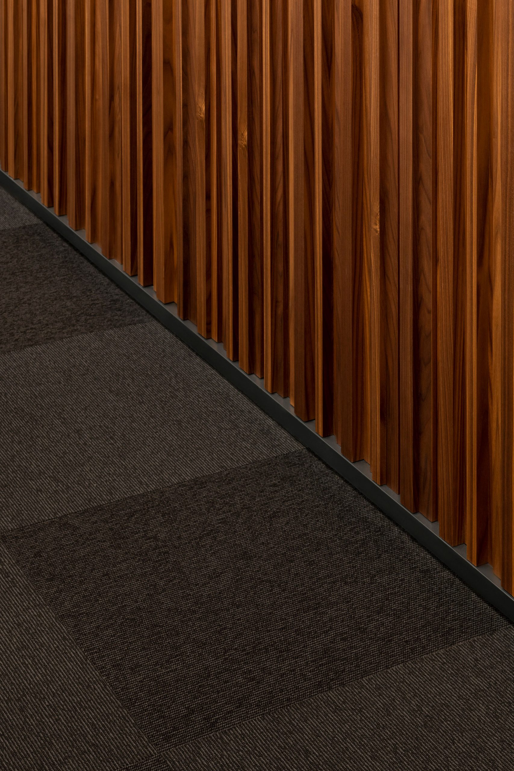 In contrasto cromatico la boiserie su disegno in noce americano dell’auditorium, una sottile pelle 3D che ne definisce il perimetro celando e svelando arredi laccati blu petrolio.