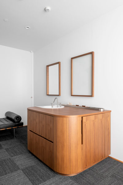 In linea con la filosofia della società, l’ambiente di lavoro è stato dotato di una nuova area wellness, un ambiente privato all’interno del quale un arredo su misura contenente tutti gli accessori necessari per una pausa rigenerante dialoga con due cornici di porte originali dei primi del ‘900 oggetto di restauro.